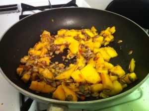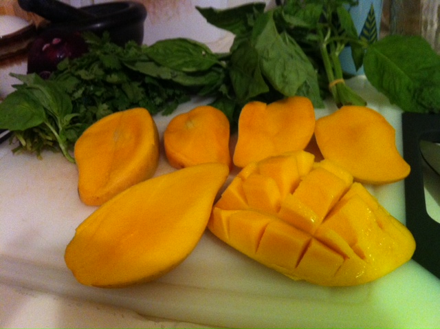 How gorgeous is that pan?! This is the first time I’ve cooked with mango and I feel a whole new world has opened up before me. The sweet, toasty smell wafting from the stove top had us both swooning. And our eyes sort of watering….we really went crazy with the chili, a move totally off the Samuelsson road map and for which we claim full responsibility.