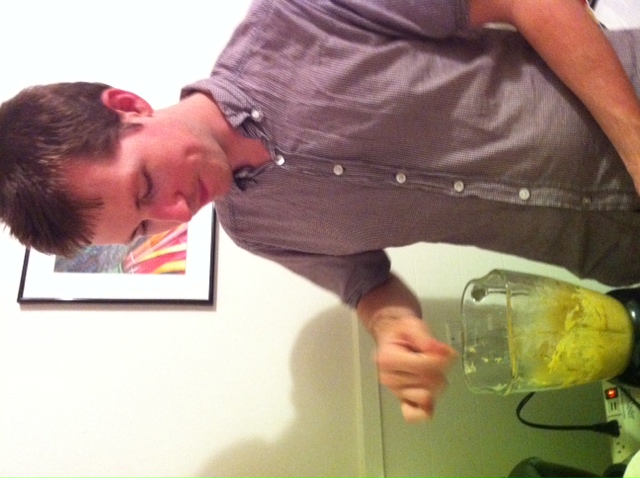 Once the mango, pumpkin seeds and chilies had sauteed in the pumpkin oil, we transferred all of it into a blender, added some tahini and lime juice and pureed until smooth. Here’s my kitchen partner pureeing. Look at him go!
