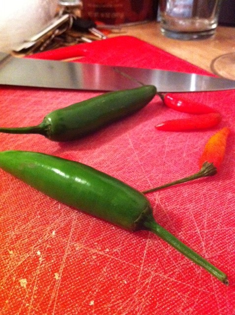 My cooking partner and I split up the duties. I took on the patties while he set about making the Mango Dip. The recipe calls for jalapeno and red Thai chilies. Being the adventurous souls that we are, we threw in a few extra red Thai chilies. Because we have no fear.