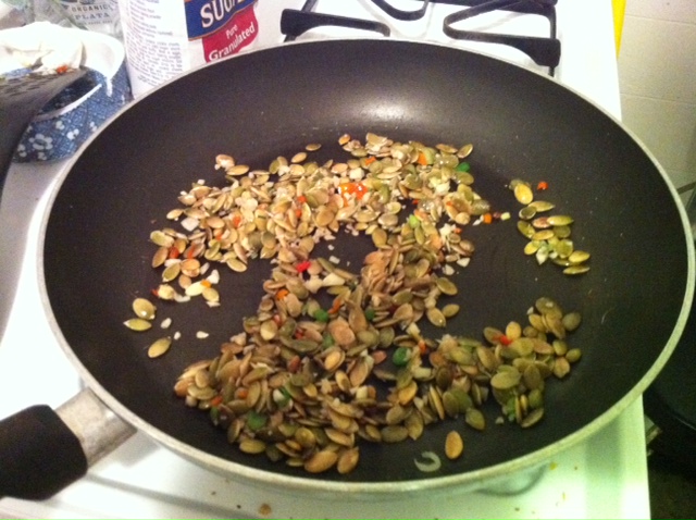 While I was discovering all kinds of things about shrimp, my cooking partner was toasting pumpkin seeds in a pan (with more chilies)…..