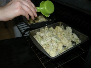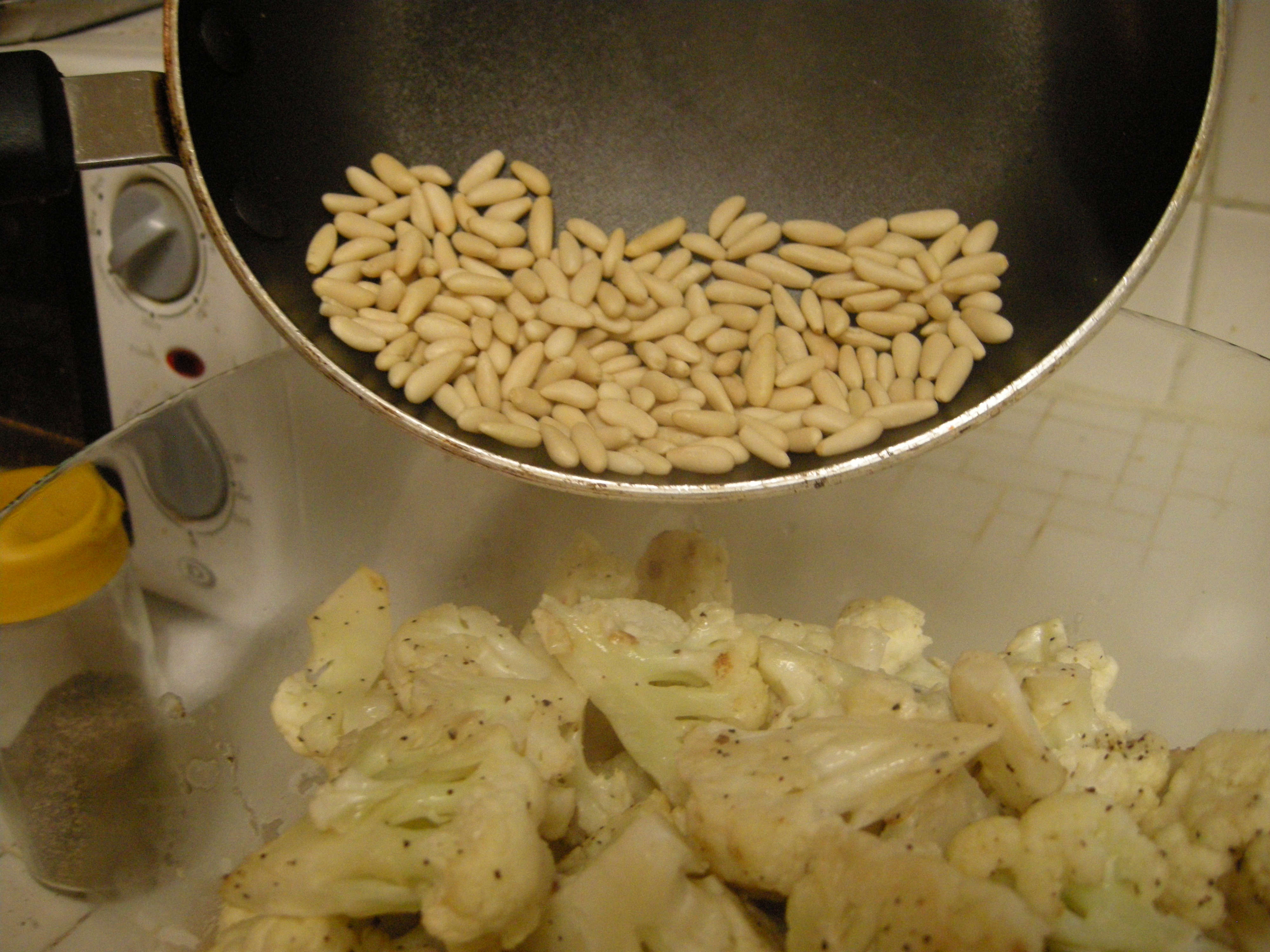 Begin by cutting up the cauliflower into florets and toss with oil in a roasting pan. Then mix in some garlic, sea salt, and fresh cracked pepper. Put in the oven at 450. In the mean time toast some pine nuts. (So good!!!)