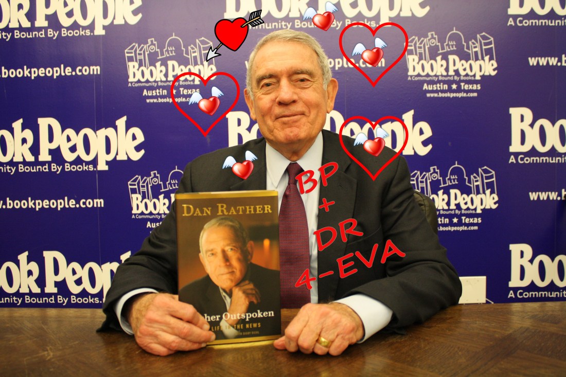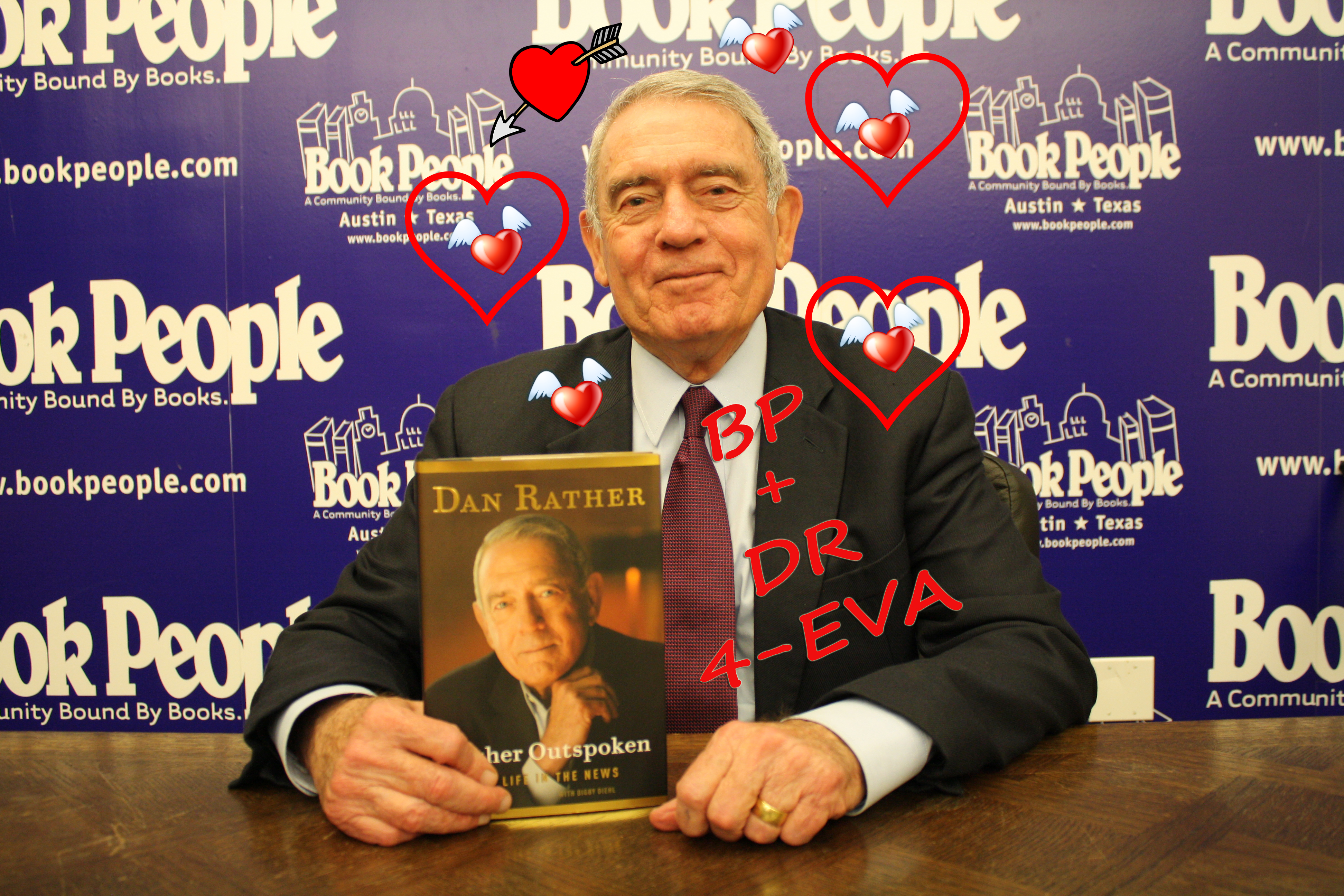 …..we fall in love. Dan Rather was here Friday night (date night if there ever was one), and his kindness and wit won us over. Was it listening to him talk about how the conglomerates running our nation’s news corporations ought to think of news as a public service? Was it his on-the-spot breakdown of Middle East politics? His live Ratherisms (“He who lives by a crystal ball learns to eat a lot of glass”)? Was it the way he said thank you every time we handed him a book during the stock signing? Oh, it was all of these things. He sealed the deal when he walked around the author handler’s car to open the driver’s side door for her before they departed for the evening; the consummate gentleman.