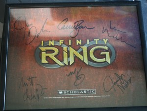 In honor of the very exciting release of the first book in what is sure to be a HUGE series we have a give away. Like this post or retweet our Infinity Ring tweet to be entered in a drawing to win a framed commemorative Infinity Ring embossed poster SIGNED by all 6 of the series’ authors.